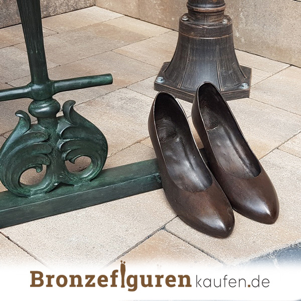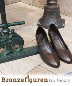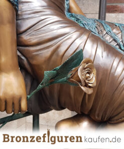 Diese wunderschöne Dame hat sich von den Fersen genommen und sitzt mit einer Rose in der Hand in einer anmutigen Pose auf dem Zaun. Die Dame, der Zaun und die Schuhe sind alle aus Bronze.
