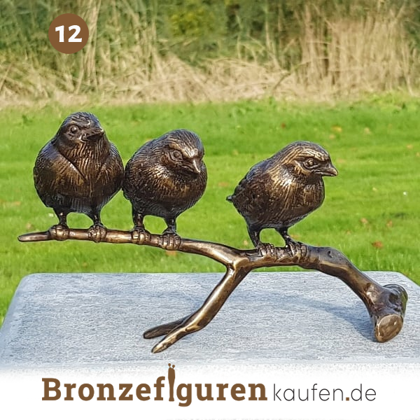 Geschenke 65 Geburtstag Frau von drei Vögeln auf einem Ast in Bronze. Diese Statue eignet sich sowohl als Gartenstatue als auch als Indoor-Statue.