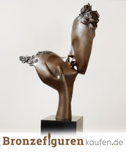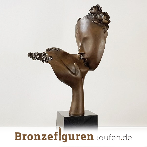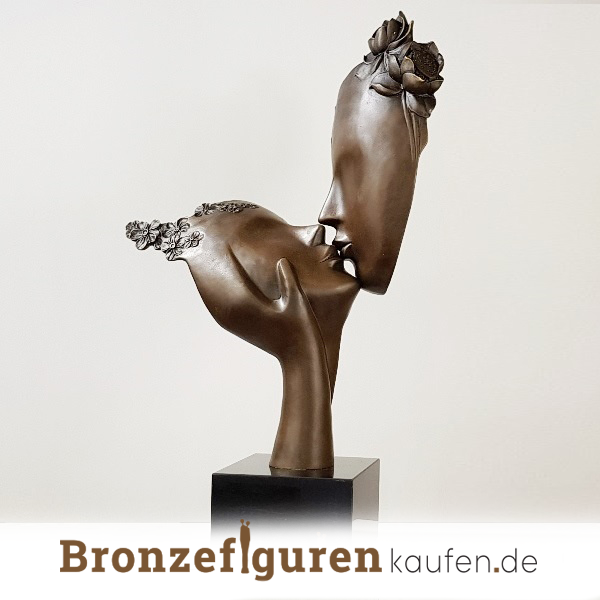 Eine besondere Bronzeskulptur von zwei Menschen, die sich gegenseitig einen liebevollen Kuss geben.