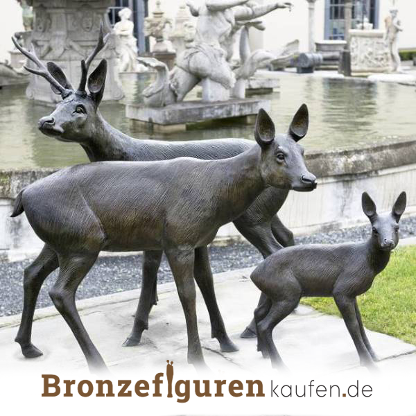 Tierstatue bestehend aus einer Hirschmutter und einem Hirschvater mit einem jungen Hirsch. Ein wunderschönes, verspieltes Ganzes für Ihren Garten.