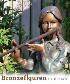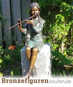 Kinderfigur garten heißt: „Sitzendes Mädchen mit Flöte“ in verschiedenen Bronzetönen als Gartenskulptur.